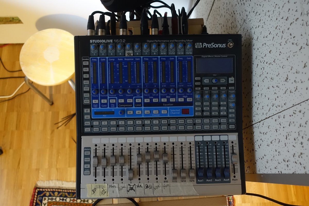 die einzelnen kanäle werden über vorgeschaltete di-boxen auf das mischpult geführt und auf dem angeschlossenen laptop mit dem programm „presonus capture“ aufgenommen.